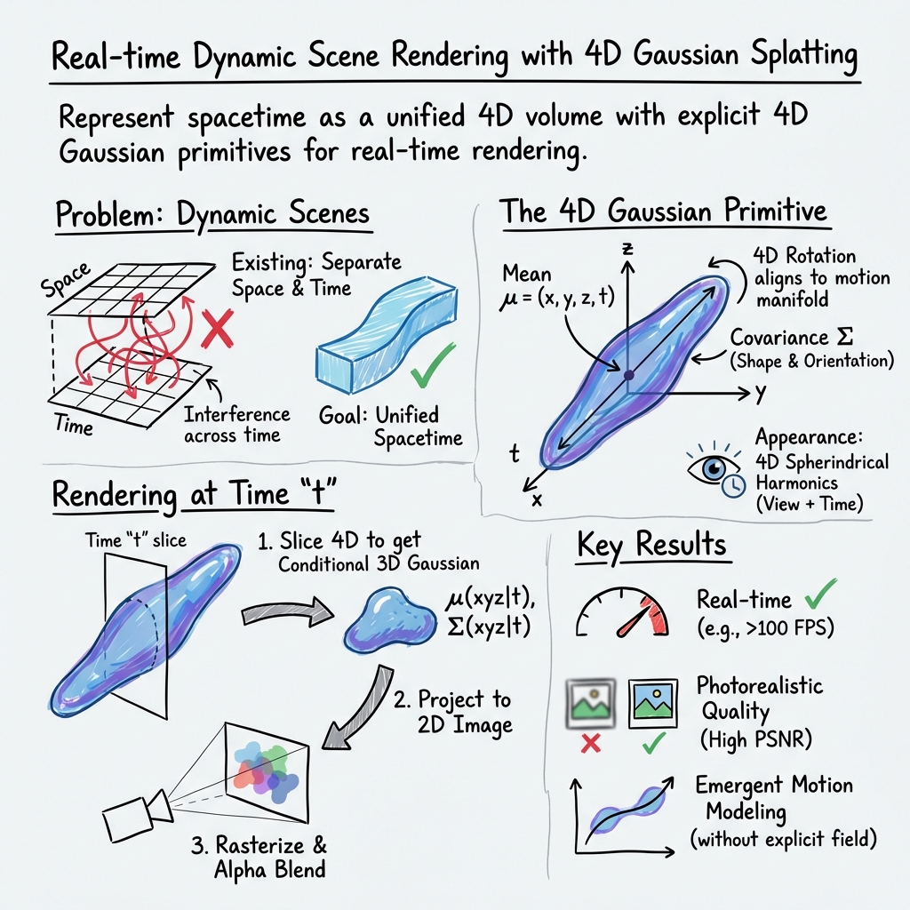 Abstract: Reconstructing dynamic 3D scenes from 2D images and generating diverse views over time is challenging due to scene complexity and temporal dynamics. Despite advancements in neural implicit models, limitations persist: (i) Inadequate Scene Structure: Existing methods struggle to reveal the spatial and temporal structure of dynamic scenes from directly learning the complex 6D plenoptic function. (ii) Scaling Deformation Modeling: Explicitly modeling scene element deformation becomes impractical for complex dynamics. To address these issues, we consider the spacetime as an entirety and propose to approximate the underlying spatio-temporal 4D volume of a dynamic scene by optimizing a collection of 4D primitives, with explicit geometry and appearance modeling. Learning to optimize the 4D primitives enables us to synthesize novel views at any desired time with our tailored rendering routine. Our model is conceptually simple, consisting of a 4D Gaussian parameterized by anisotropic ellipses that can rotate arbitrarily in space and time, as well as view-dependent and time-evolved appearance represented by the coefficient of 4D spherindrical harmonics. This approach offers simplicity, flexibility for variable-length video and end-to-end training, and efficient real-time rendering, making it suitable for capturing complex dynamic scene motions. Experiments across various benchmarks, including monocular and multi-view scenarios, demonstrate our 4DGS model's superior visual quality and efficiency.