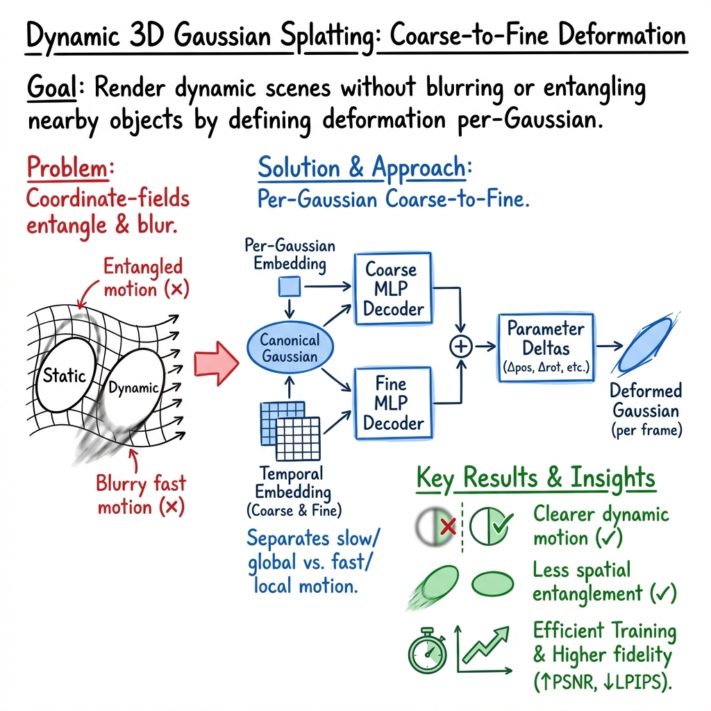 Abstract: As 3D Gaussian Splatting (3DGS) provides fast and high-quality novel view synthesis, it is a natural extension to deform a canonical 3DGS to multiple frames for representing a dynamic scene. However, previous works fail to accurately reconstruct complex dynamic scenes. We attribute the failure to the design of the deformation field, which is built as a coordinate-based function. This approach is problematic because 3DGS is a mixture of multiple fields centered at the Gaussians, not just a single coordinate-based framework. To resolve this problem, we define the deformation as a function of per-Gaussian embeddings and temporal embeddings. Moreover, we decompose deformations as coarse and fine deformations to model slow and fast movements, respectively. Also, we introduce a local smoothness regularization for per-Gaussian embedding to improve the details in dynamic regions. Project page: https://jeongminb.github.io/e-d3dgs/
