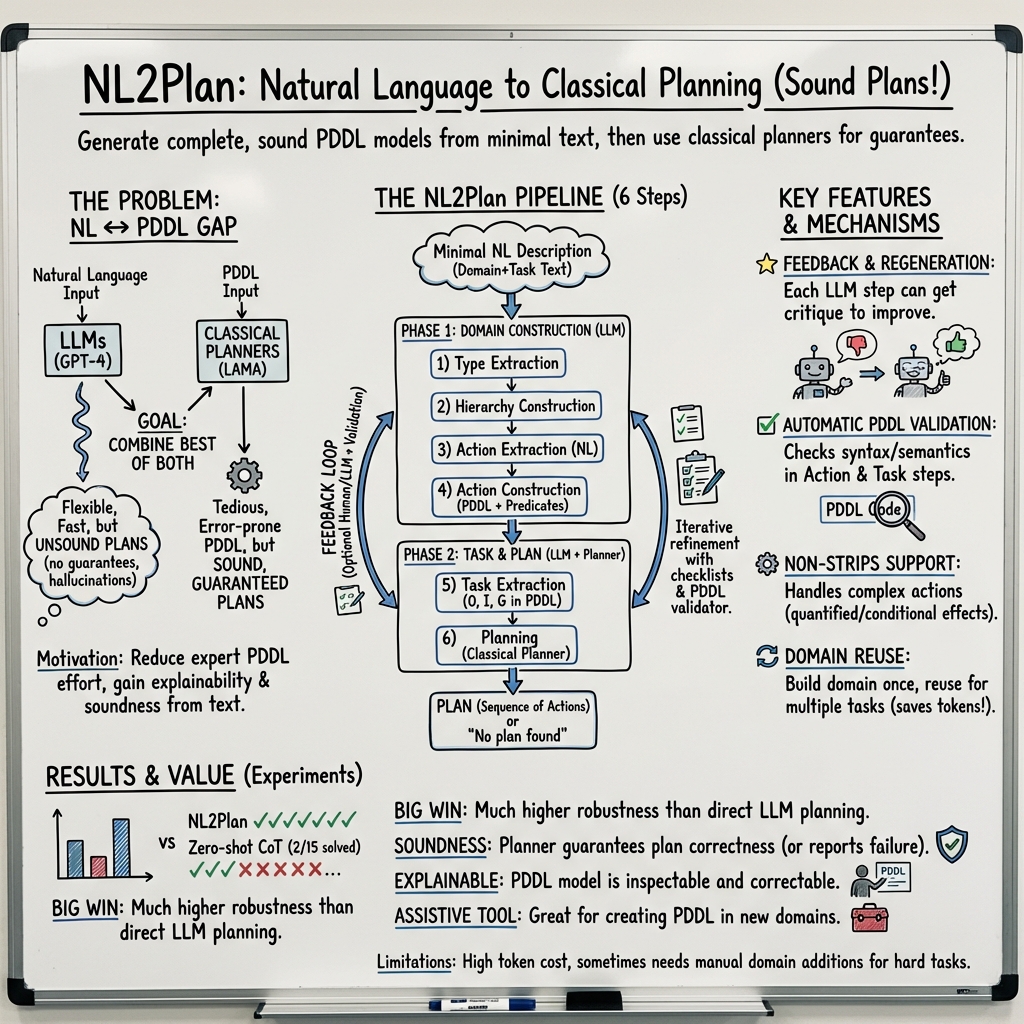 Abstract: Today's classical planners are powerful, but modeling input tasks in formats such as PDDL is tedious and error-prone. In contrast, planning with LLMs allows for almost any input text, but offers no guarantees on plan quality or even soundness. In an attempt to merge the best of these two approaches, some work has begun to use LLMs to automate parts of the PDDL creation process. However, these methods still require various degrees of expert input. We present NL2Plan, the first domain-agnostic offline LLM-driven planning system. NL2Plan uses an LLM to incrementally extract the necessary information from a short text prompt before creating a complete PDDL description of both the domain and the problem, which is finally solved by a classical planner. We evaluate NL2Plan on four planning domains and find that it solves 10 out of 15 tasks - a clear improvement over a plain chain-of-thought reasoning LLM approach, which only solves 2 tasks. Moreover, in two out of the five failure cases, instead of returning an invalid plan, NL2Plan reports that it failed to solve the task. In addition to using NL2Plan in end-to-end mode, users can inspect and correct all of its intermediate results, such as the PDDL representation, increasing explainability and making it an assistive tool for PDDL creation.