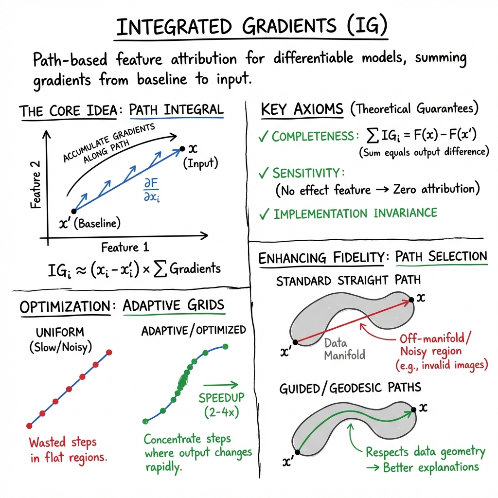 - Integrated Gradients is a feature attribution method that integrates local gradients along the straight-line path from a baseline to the input, ensuring axiomatic properties like completeness and sensitivity.